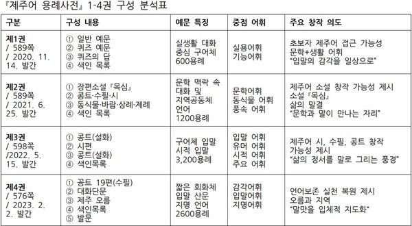 아래 분석표에서는 독자의 이해를 돕기 위해 필자 나름의 ≪제주어 용례사전≫ 네 권의 구성 체계를 분석하여 제시한다.