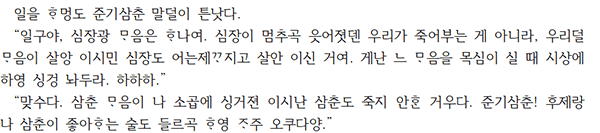 “일구야, 심장광 ᄆᆞ음은 ᄒᆞ나여…”로 시작되는 준기 삼촌의 환청은 일구에게 삶을 지탱해주는 정서적 기억의 중심축으로 작용한다. 이미 세상을 떠났지만, 그의 목소리는 여전히 일구의 내면에 살아 있어 삶의 결정을 이끌고 감정을 다독이는 ‘정서적 멘토’로 남는다. 작품 속에서 ‘심장’은 인간의 진심과 감정, 윤리적 결단이 응축된 상징어로 기능하며, 제주어는 그 떨림을 가장 생생하게 전달하는 감각적 언어로 작용한다.