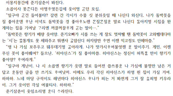 삼촌은 이제 히야신스를 좋아한다고 말하며, 마당 한구석에 그 꽃을 잘 가꾸라고 당부를 남긴 채 사라진다. 이는 ‘향기’라는 감각을 통해 시적 감정을 다시 되살리려는, 말 너머의 위안이자 삶을 이어가는 회복의 언어다. 무엇보다 이 장면에 배어 있는 ‘ᄆᆞᆫ질ᄆᆞᆫ질ᄒᆞᆫ, 꺼끌꺼끌ᄒᆞ게, 고와뷉데다마는, 혀뜩ᄒᆞᆯ...’등등 제주어 고유의 어조와 말맛은 정서를 더욱 생생하게 드러내며, 정겹고도 실감 나는 표현들 속에서 말이 곧 기억이고 향기이며 존재의 흔적이 되는 방식을 섬세하게 구현한다.