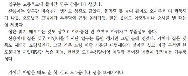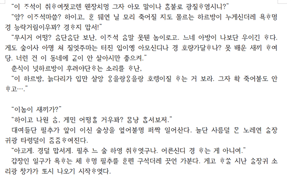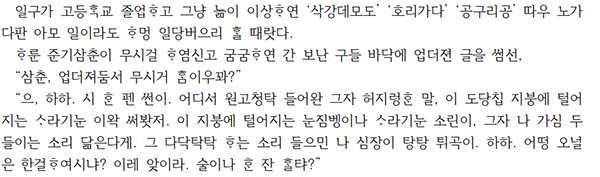 위 대목은 고등학교 시절부터 친했던 일구, 찬용, 용성 세 친구가 오랜만에 재회해 당구를 치고 무근성의 고망술집에서 막걸리와 소주를 나누며 옛날처럼 웃고 떠드는 장면이다. 하지만 이어지는 분위기는, 그곳에 있던 여인을 둘러싼 한 남자의 난입으로 갑자기 깨지고, 술상은 엎어지며 아수라장이 된다. 여인의 남편인 주팔이 친구들까지 불러 난동을 부리자 일구와 찬용, 용성은 함께 맞서 싸우고 결국 경찰서까지 가게 된다. 상황은 의외로 정리되지만, 이 사건은 친구들이 어릴 적처럼 삶이 거칠게 몰아쳐도, 여전히 등을 맞대고 버틸 수 있다는 믿음. 끈끈한 동료애와 공동체적 연대의 일면을 보여준다.