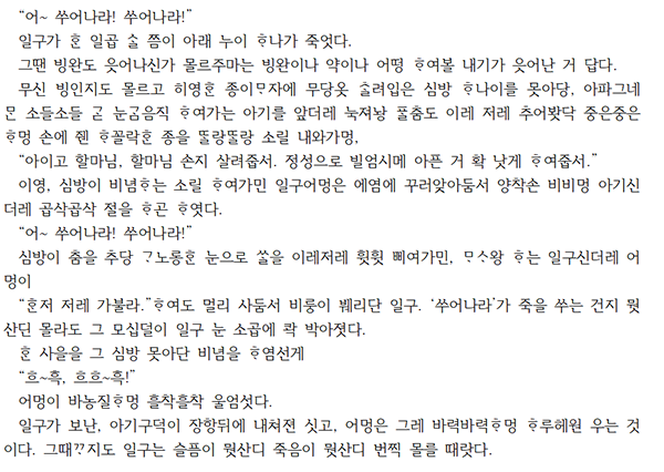일구의 아내는 “우리 불쌍ᄒᆞᆫ 준이”를 연신 되뇌며 목 놓아 운다. 그 울음은 자식을 지켜내지 못한 어미로서의 처절한 절망이며, “나 때문이야…”라는 자책 속에는 씻을 수 없는 죄의식이 짙게 배어 있다. 이 장면은 최근 화제작 드라마 ≪폭싹 속았수다≫의 한 장면과 겹쳐진다. 새 생명을 품고 새로운 삶에 대한 희망에 부풀었던 애순 역시, 태풍이 몰아치던 어느 날 아이를 허망하게 떠나보낸다. 그녀가 마주한 상실과 혼란, 그리고 하늘을 향해 원망조차 하지 못한 채 껴안은 무력감은, 소설 속 일구 부부가 감내하는 슬픔과 동일한 무게로 다가온다.