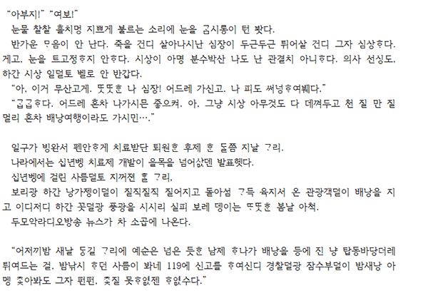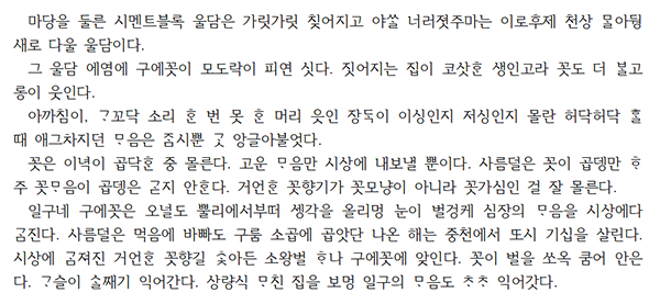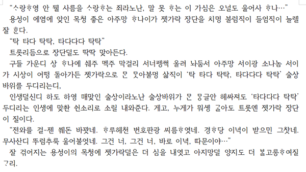 ※‘아래아’는 인터넷 표기가 되지 않은 게 많으므로, 작품집 표기와는 달리 작품평에서는 편의상 ‘ㅗ’로 표기했습니다.