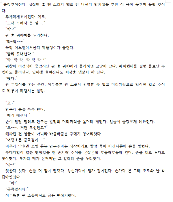 무엇보다 이 장면의 청각적 구성은 인상적이다. “개덜광 가마귀덜이 제만썩 울르는 소리”는 죽음의 기척이 위협으로 다가오는 음향으로 작용하며, 그 위를 가르며 울려 퍼지는 “살아산다! 살아산다!”는 절박한 생의 명령이다. 그것은 언어 이전의 심장 박동처럼, 말보다 앞서는 가슴의 울림이며, 이 작품이 말하고자 하는 존재의 윤리가 절실하게 발화되는 지점이다.