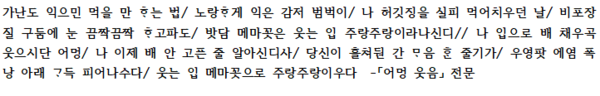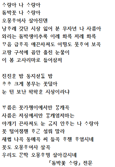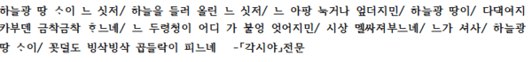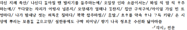 아내가 잠시라도 보이지 않으면 '시상 멜싸져부느녜'라며 세상이 무너져버린다고 할 정도로, 시적 화자의 마음엔 아내가 삶의 전부처럼 자리하고 있다. 그러기에 '느가 셔사/ 하늘광 땅 ᄉᆞ이/ 꼿덜도 빙삭빙삭 곱들락이 피느녜'라는 구절은 참 따뜻하고도 눈물겹다. 당신이 있어야 비로소 꽃들도 웃고, 계절도 온전해지고, 세상도 살아 숨 쉰다는 그런 고백이 이 시 안에 곱게 피어 있다.