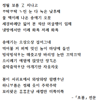 이 시는 단지 봄의 정경을 묘사하는 데 그치지 않고 제주어가 지닌 말맛의 감각성과 공동체의 정서를 생기 있게 되살려낸다. 이처럼 풍경과 언어가 맞물릴 때 지역어는 하나의 정서적 풍경으로 확장된다.