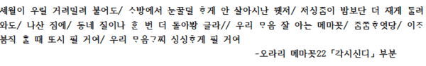 각시에 대한 사랑은 「오라리 메마꼿22–각시신디」에서도 그대로 전해진다. 세월이 우리를 밀쳐내고 등을 돌린다 해도 우리 둘이면 된다. 아무리 힘겨운 날이 와도 서로를 놓지 않겠다는 시인의 의지가 담겨 있다. 가장 가까운 벗으로서의 부부, 나이를 먹어도 변치 않는 그 마음을 메마꼿에 빗대어 되새긴다.