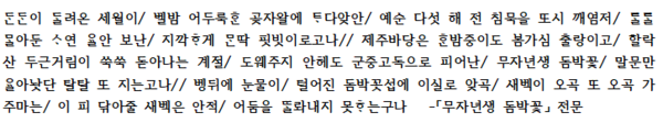 이 시 역시 제주어의 고유한 리듬 속에서 4·3의 기억을 환기시킨다. '벨밤 어두룩혼 곶자왈'에서 되살아나는 침묵은 말해지지 않은 역사적 상흔의 현장을 불러낸다. 시적 화자는 '핏빗이로고나'라는 표현을 통해 그 속에 스러져간 목숨들과 침묵 속에 묻힌 고통을 드러낸다. '이 피 닦아줄 새벡은 안적'이라며, 반복되는 아침 속에서도 진정한 치유와 위로는 아직 도달하지 않았다고 한다. 동백은 이처럼 침묵의 무게를 머금은 채 시간을 견디며 그 상흔을 고스란히 품고 있다. '어둠을 ᄄᆞᆯ롸내지 못ᄒᆞ는구나'라며 아직도 아픔이 씻겨지지 않았음을 고백하면서도, 그 상처 위에 놓인 무게를 함께 감당해 나가야 하는 제주의 현실을 직시하게 한다.