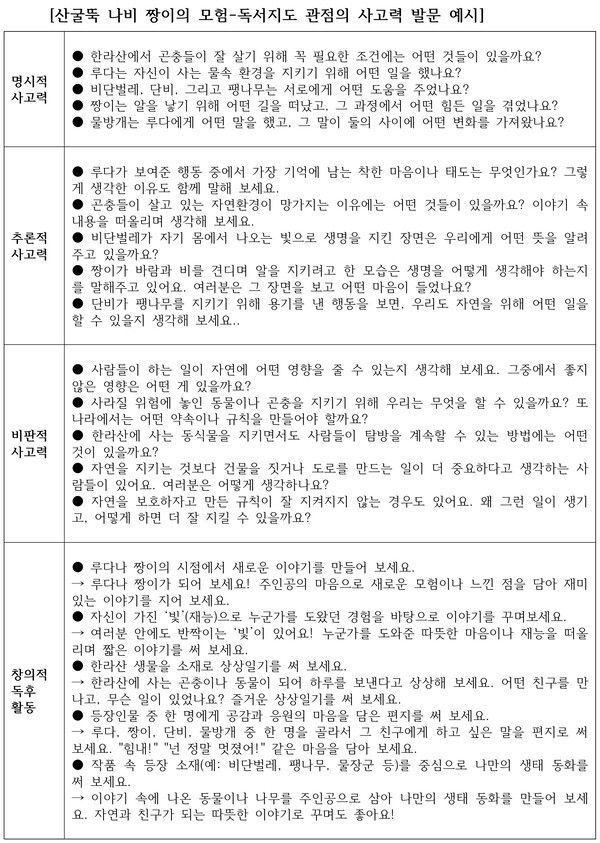≪산굴뚝나비 짱이의 모험≫을 바탕으로 독서지도 관점에서 제안한 사고력 유형별 발문 예시이다. 이 발문들은 독서 지도 상황에 따라 유연하게 활용될 수 있으며 교사는 이를 적절히 응용하거나 새로운 질문으로 확장해 어린이들의 사고를 더욱 깊고 다양하게 자극할 수 있다. 아래 발문표는 이러한 관점에서 필자가 분석해 정리한 것으로, 온가족 독서 시간이나 독서지도사 또는 학교 교사의 주도 아래 이루어지는 독후 활동과도 효과적으로 연결되기를 기대한다.