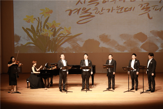 “외로움 더욱 외롭게 하는 사랑 되는가” 안현순 작곡가는 이 시구에 담긴 감정을 절제된 남성 5중창으로 풀어낸다. 화려함보다는 속울음을 닮은 울림으로 눈처럼 조용히 쌓이는 감정을 감싸안는다. 말하지 못한 마음들이 켜켜이 쌓여 결국 음악이 되어버린 순간 그 노래와 선율 속에서 관객은 문득 자기 안의 오래된 장면을 하나씩 떠올리게 된다. 상처마저도 꽃이 되는 순간! 이것이 시적 울림이다. 겨울 한복판에서 피어난 수선화처럼 차갑고도 따뜻하게.