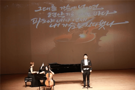 고성기 시, 바리톤 최규현의 독창, 박소현의 첼로연주, 김향숙의 피아노 연주가 어우러지며 한 곡의 입체적 서사가 완성된다. 고성기 시인의 시에는 바다가 있다. 다가갈 때는 밀물처럼 돌아설 때는 썰물처럼 출렁이는 가슴이 있다. ‘그대를/ 가슴에 넣으면/ 현악기로 떠는 바다’ 사랑은 가슴 안에서 진동하고 그 떨림은 어느 순간 음악이 된다. 안현순 작곡가는 이 정서를 첼로와 피아노 그리고 바리톤의 병렬 구성으로 입체화한다. 첼로의 선율은 바람 같고, 파도 같으며, 바리톤의 울림은 속 깊은 물결처럼 퍼져나간다.