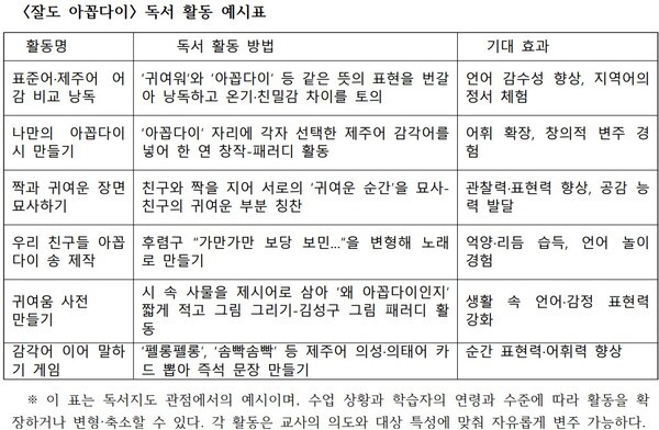 아울러, 제주어 어휘의 사용은 시의 감수성을 한층 높인다. ‘아꼽다이’는 귀여움의 정도와 대상에 따라 미묘하게 달라지는 온도를 지니며, ‘우영팟’(텃밭), ‘펠롱펠롱’(반짝반짝) 같은 말은 표준어 번역으로 대체할 수 없는 질감을 전한다. 이러한 언어는 화자의 감정뿐 아니라 그 감정이 뿌리내린 생활 환경과 공동체의 풍경을 함께 불러온다. 또한 의태어·의성어의 리듬감은 시의 ‘귀여움’을 생생한 체험으로 만든다. ‘헤삭헤삭’, ‘솜빡솜빡’과 같은 소리는 시각과 청각을 동시에 자극하며, 읽는 이의 몸에 작은 울림을 남긴다. 이처럼 감각어가 빚어낸 리듬은 시의 주제와 정서를 물결처럼 퍼뜨린다. 이러한 언어적 특성과 감각적 요소를 실제 독서 수업에서 활용하기 위해 설명한 내용을 이해하기 쉽게 아래 예시표를 제시한다.